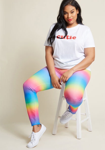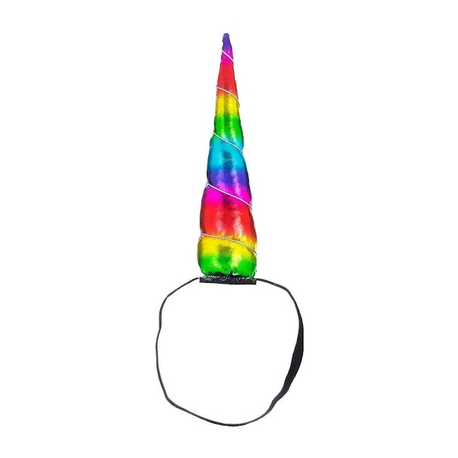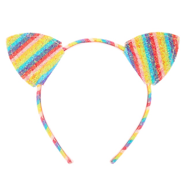 Claire’s Club Rainbow Glitter Cat Ears Headband, $6.99, Claire’s; Unicorn Horn Headband, $3, Party City; Fuzzy Knit Sweater, $22.90, Forever 21; Rainbow Glow Leggings, $11.97, ModCloth.