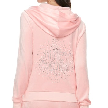 Women’s Juicy Couture Graphic Velour Hooded Jacket, $54, Kohl’s; Abercrombie Denim Mini Skirt Frayed, $12, Poshmark; LIONWAN Aviator Sunglasses, $19.99, Amazon; NWT Bling Rhinestone Crown Trucker Hat, $22, eBay.