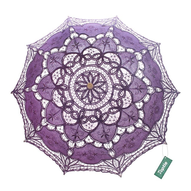 TopTie Lace Umbrella Parasol, $17.99, Amazon; Forever Young Women’s Short Shaft Rain Boots, $19.99, Walmart; Purple Metallic Fringe, $5.99, Oriental Trading; Into The Night Purple Skater Dress, $49, LuLu’s.