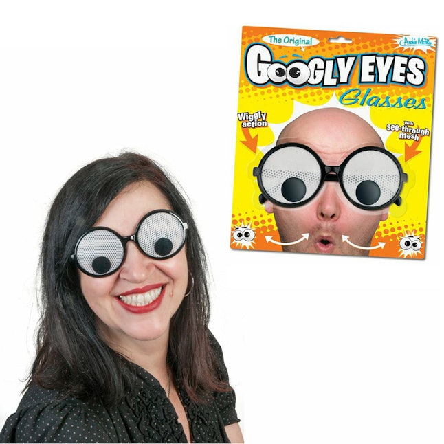 Lace Up Swing Dress, $12.90, Forever 21; Poo Hat, $6.77, eBay; Googly Eyes Glasses, $8.99, Retro Planet.