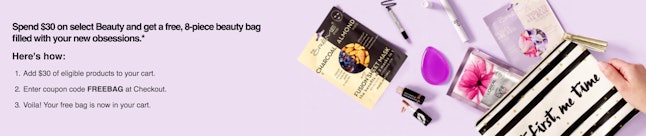 If you are shopping online, the same concept applies. Add $30 of eligible items to your cart. Enter the "FREEBAG" code at checkout and you’re dunzo.