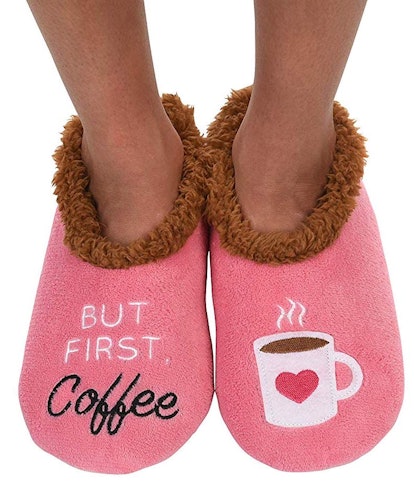 If you’re looking for statement slippers (I mean, who isn’t?), these slipper socks by Snoozies are for you. Since they’re more of a sock, they don’t have an inner or outer sole, but they do have a thin strip of plastic on the bottom for traction. Crafted with a lightweight fleece material, these are great for wearing around the house. However, they aren’t the most durable or warmest option on this list. What sets them apart is their embroidered graphics with fun illustrations and sayings like the featured pair, above, that reads, "But first, coffee." Eighteen other graphics are available including a few homages to wine.