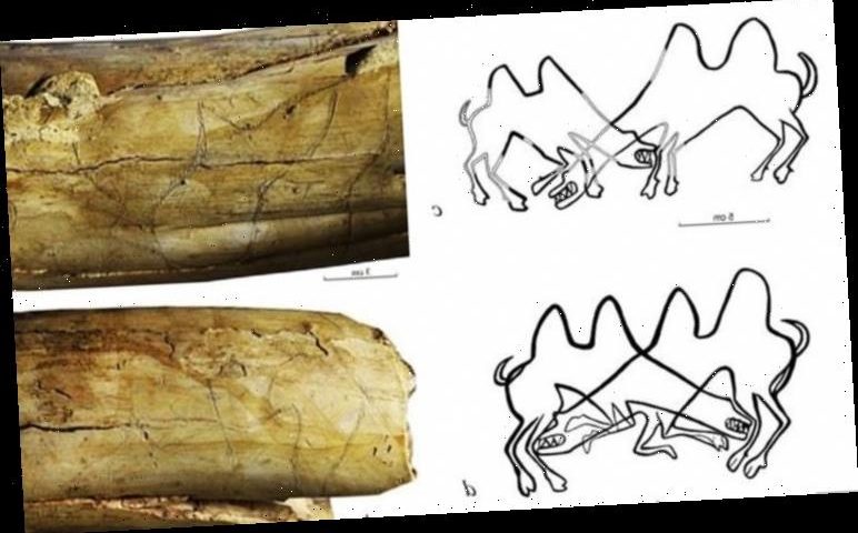Archaeologists studied a 5ft (1.5m) long tusk featuring drawings of four camels and a human in a camel suit discovered in the lower Tom river…
