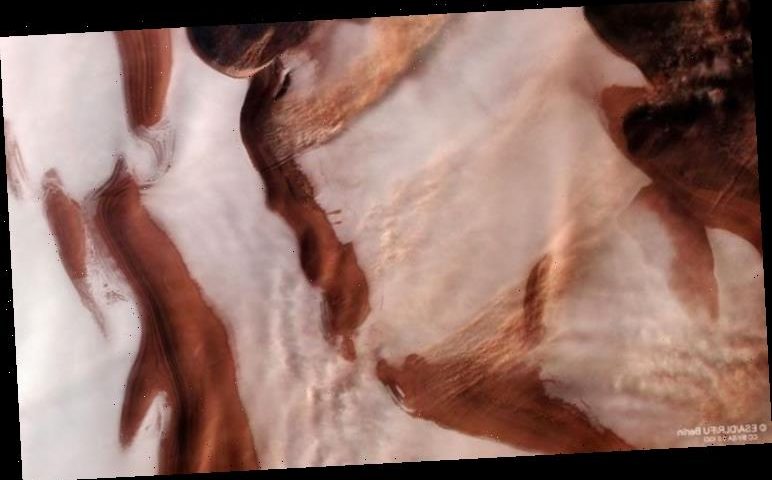 The European Space Agency (ESA) satellite photo depicts swathes of ice, dark troughs and depressions and indications of strong winds and storms. The Martian poles…