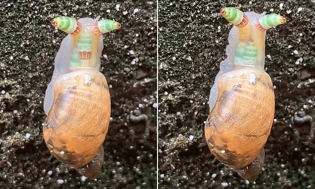 Freaky ‘zombie-snail’ appears to FLASH green and orange after contracting parasite which invades the mollusc’s eyeballs The shelled gastropod was seen crawling across Taiwan’s Changhua…