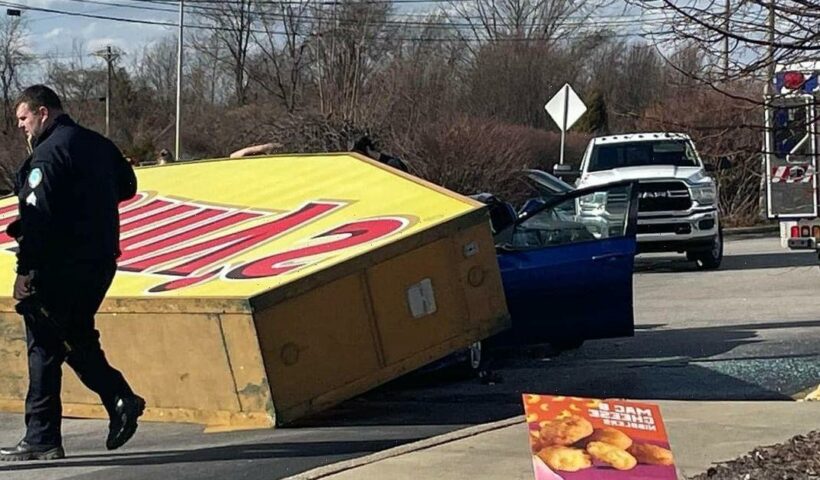 A 72-year-old woman has died and two others have been injured after a restaurant sign fell on their car crushing it "on the way back…