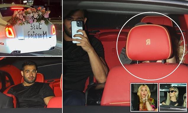 Britney Spears and her husband Sam Asghari were spotted leaving their wedding on Thursday night in a white ‘Just Married’ Rolls Royce after their lavish nuptials at the singer’s California home.