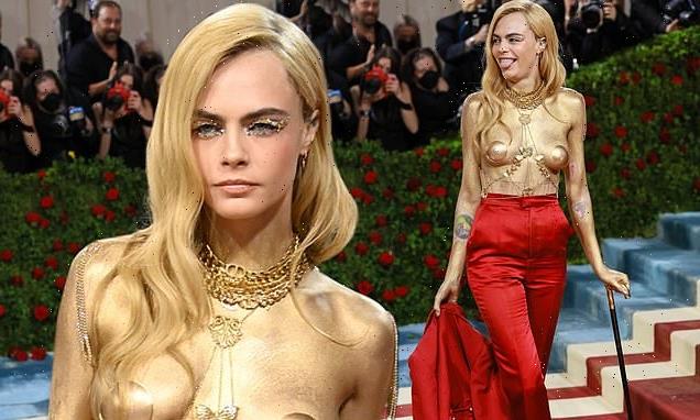 Met Gala 2022: Cara Delevingne goes TOPLESS as she rips off her red jacket to unveil gold painted body during shock red carpet arrival