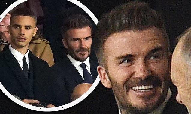 David, 46, was joined by one of his three sons, 19-year-old Romeo, to watch Manchester United take on Arsenal at Old Trafford, and both cut dapper figures in smart suits and ties.