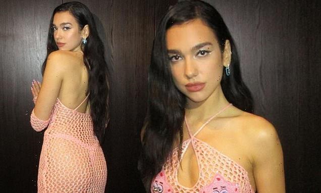 Dua Lipa goes braless and displays her peachy posterior in a pink fishnet dress as she poses in sizzling snaps before heading out in Melbourne