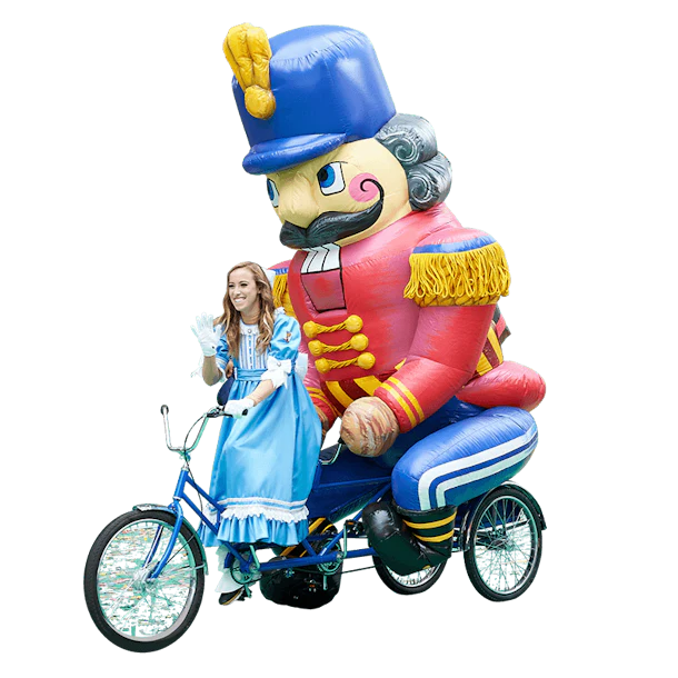 Don’t worry, I had no idea what a trycaloon was at first, either. But it turns out, they are those balloon-tandem tricylcles that feature an inflatable character pedaling in the back seat — like this one of Clara giving The Nutcracker a lift.