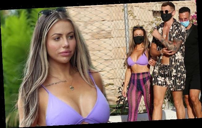 Holly Hagan showcases her incredible physique in a lilac bikini and sheer purple trousers as she steps out with fiancé Jacob Blyth in Ibiza
