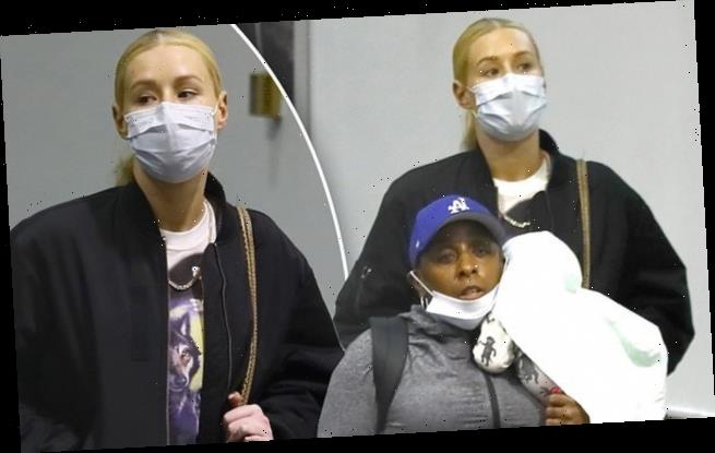 Iggy tied her blonde locks into a ponytail at the nape of the neck, and wore a face mask.