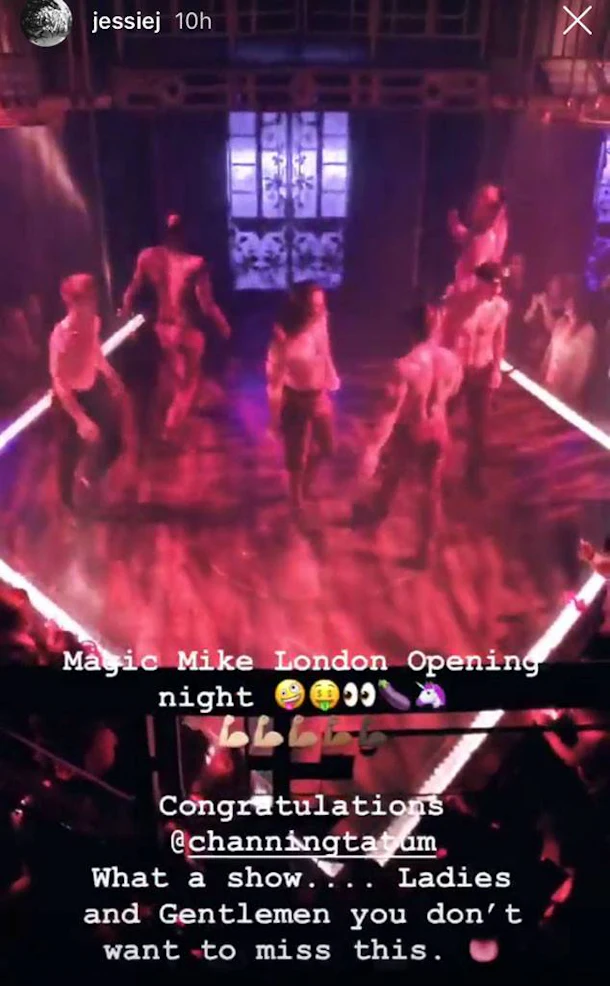 Jessie J posted a photo of the Magic Mike Live stage complete with dancing shirtless men. She captioned the photo, "Magic Mike London Opening night. Congratulations @channingtatum what a show… Ladies and Gentlemen you don’t want to miss this."