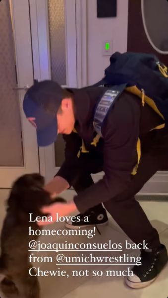 “Lena loves a homecoming!” the mom of three wrote. “@joaquinconsuelos back from @umichwrestling. Chewie, not so much.”