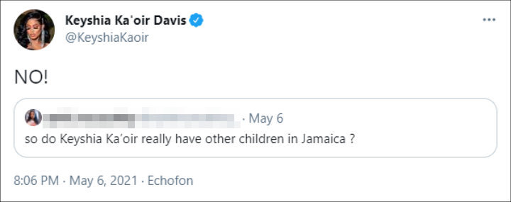 On Thursday, May 6, she responded to a fan who tweeted, “So do Keyshia Ka’oir really have other children in Jamaica?” Keyshia apparently caught wind of the tweet and simply shut it down by responding, “NO!”
