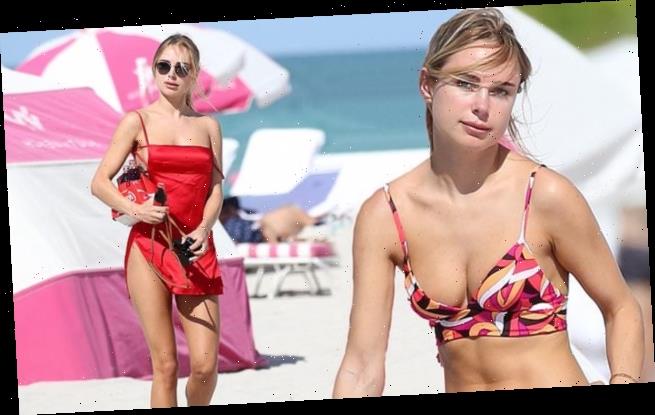 Kimberley Garner sizzles in a skimpy geometric bikini and red slip dress as she hits the beach on sun-soaked getaway to Miami