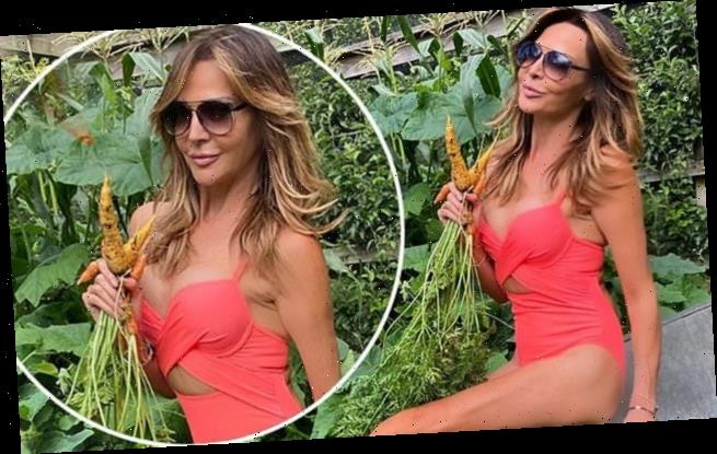 Lizzie Cundy, 52, puts on a leggy display as she harvests her carrots in a striking coral swimsuit and wellies