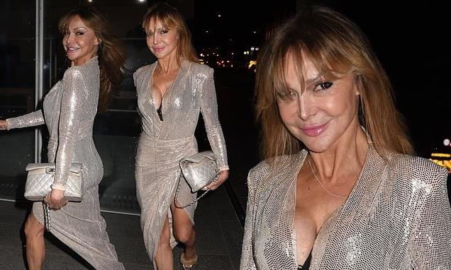 ‘Bit of sparkle’: Lizzie Cundy amps up the glamour in plunging maxi dress with sequin embellishment as she heads to Talk TV studios in London