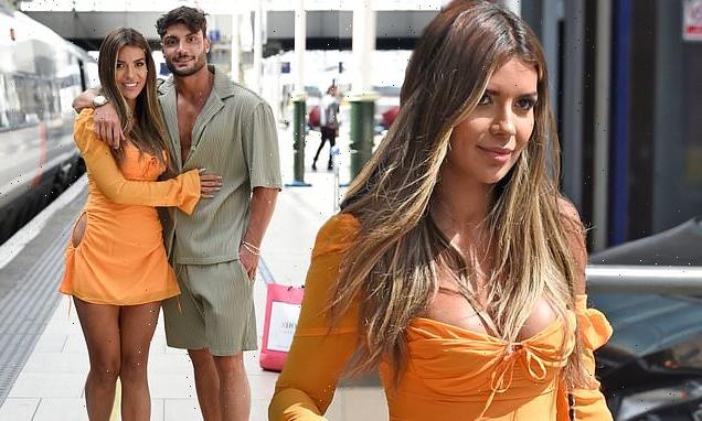 Love Island’s Ekin-Su Culculoglu risked a wardrobe malfunction in a low-cut orange dress as she arrived with Davide Saclimenti in his hometown of Manchester on Tuesday.