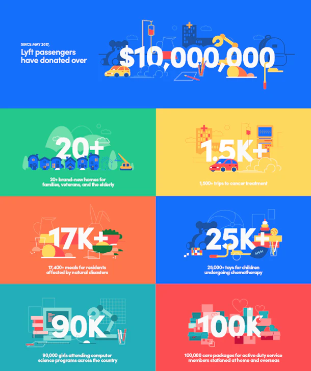 If you want a better idea of how Lyft has directly impacted society with the $10 million raised from Round Up & Donate, passengers have raised enough money to fund over 1,500 trips for patients to get cancer treatment, according to a press release, as well as 17,000 meals for natural disaster victims, 25,000 toys for child cancer patients, 90,000 girls to participate in computer science programs, and 100,000 care packages for active duty service members globally. It’s always reassuring to see how your money is helping, and it’s clear that Round Up & Donate has left a direct and positive impact. Check out the infographic for more details.