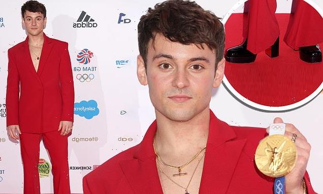 Tom Daley took fashion inspiration from Harry Styles as he arrived at the Team GB ball in a flamboyant red suit and platform heels in London on Thursday night.