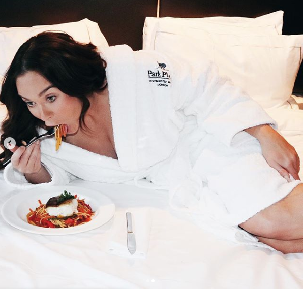 But keen to keep things real, the star then added a second photo which sees her in a slightly less glamorous state while chowing down on the plate of grub.