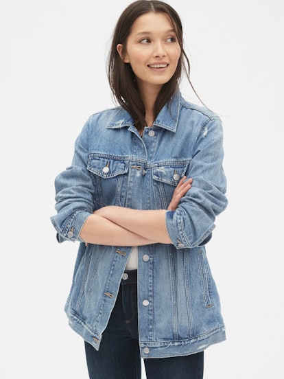 If you like more length with your jackets, check out Avens Womens Blue Longline Distressed Denim Jacket ($53, Walmart). You’ll truly feel all wrapped in denim with this super oversized option.
