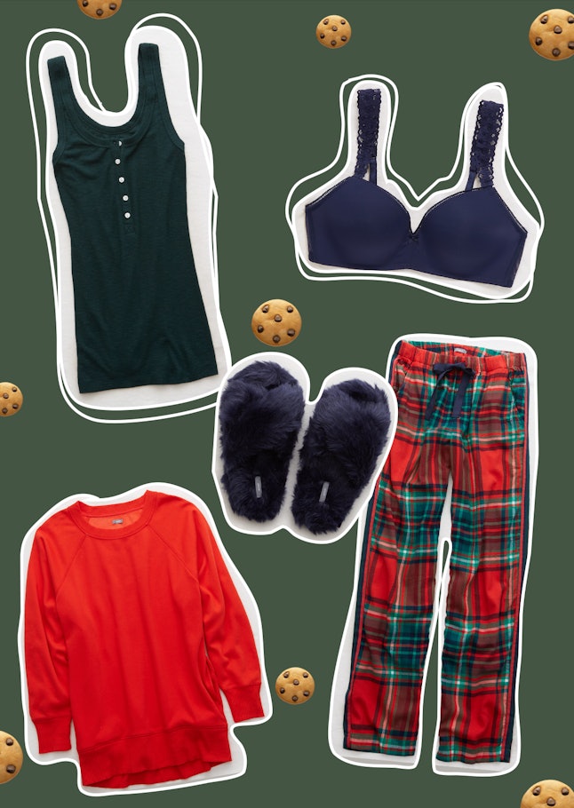 Sweatshirt, Tank Top, Flannel PJ Pants, Bra, Slippers, Aerie.