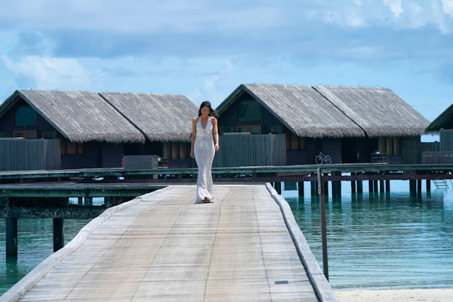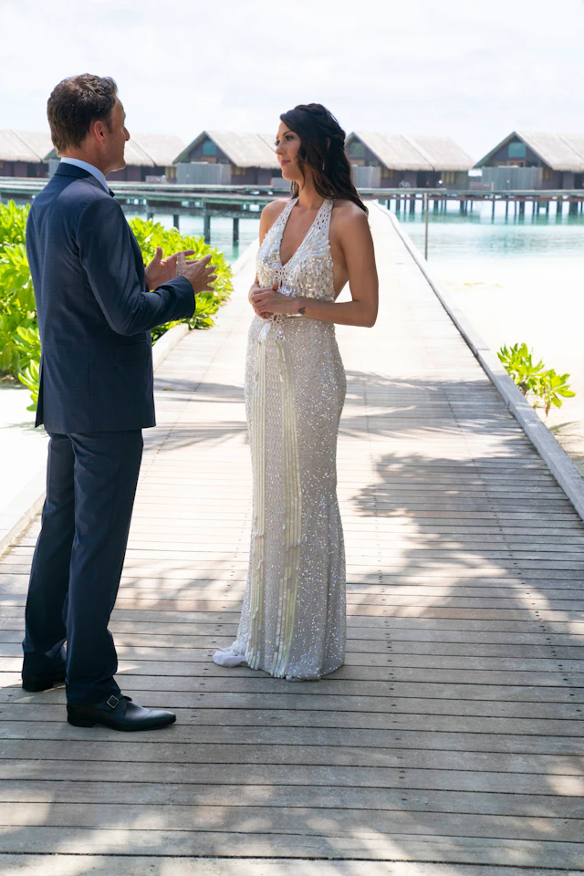 For tonight’s Season Finale, Becca absolutely stuns in a long, bright white gown with a mermaid-style silhouette, a halterneck, and an open back.