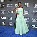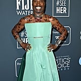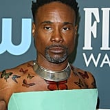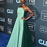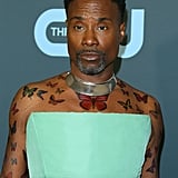 Billy Porter, who is all for wearing whatever the hell he likes — be it a velvet dress or an angelic white tuxedo with a floor-trailing feathered train — hit the Critics’ Choice Awards red carpet in a strapless satin gown. The two-tone design reminded us instantly of Ariel’s mermaid tail, but naturally the colorblock effect made it way more chic. The fitted bodice gave way to temporary butterfly tattoos on Billy’s chest, which were honestly the focal point of the Pose star’s statement look. The ensemble was capped off with a thick metallic choker. Billy was glowing as he showed off his gown from every angle, seafoam in the front, teal in the back. Keep reading to see Billy’s moment in full, and don’t forget to zoom in on his arm cuffs and chunky silver rings, too.