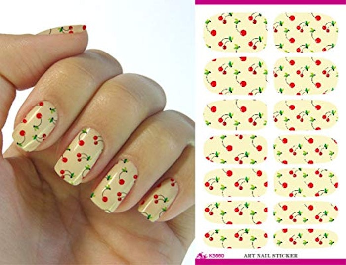 If even applying a base coat to stick your cherry onto is too much work for you (I’ve been there, I get it), then try these cherry-studded nail wraps. Their creamy base hue lets them look a little bit retro and they’ll ensure your mani looks absolutely perfect.