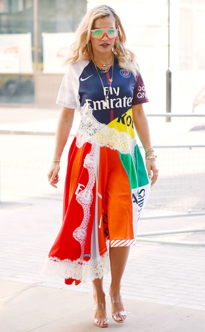 This Keeping Up With the Kardashian star stuns in silky, blue trousers paired with neon orange Poppy Lissiman shades. This is a new way to color block.