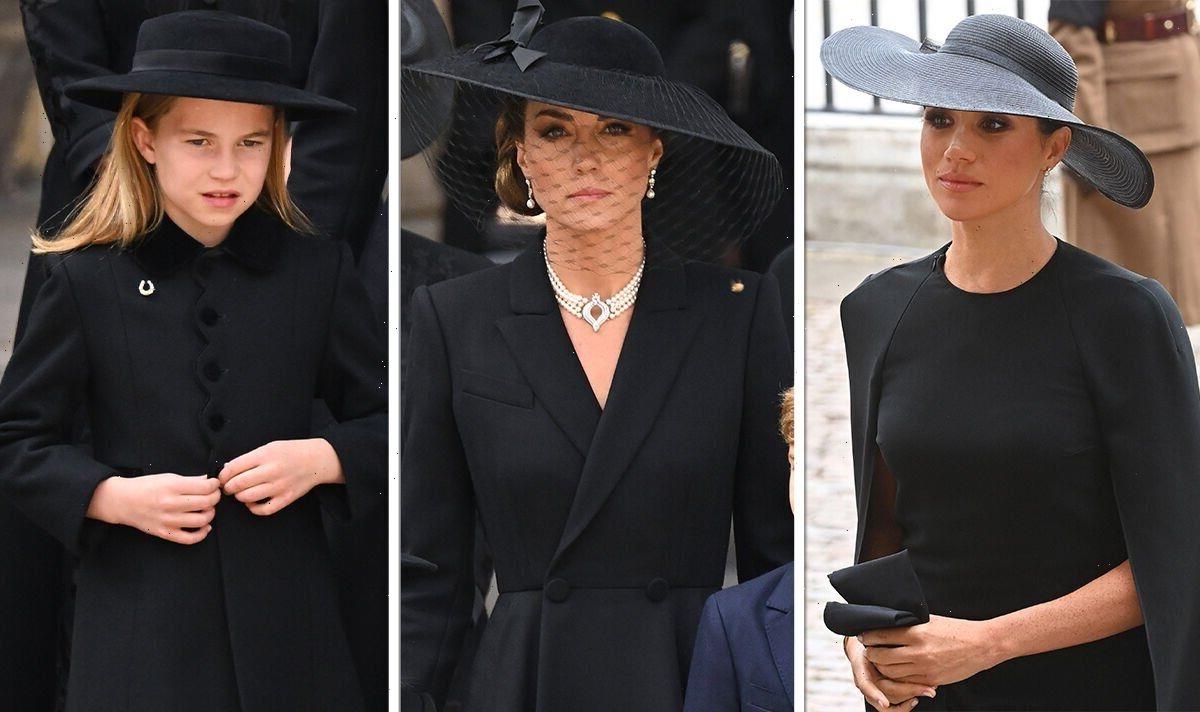 The royal jewellery collection is one of the most famous in the world, and several stunning pieces were worn by Kate, Princess of Wales, Meghan, Duchess of Sussex and Princess Charlotte as they attended the Queen’s state funeral on Monday. A common motif was pearl jewellery, as the gems have long been considered by the Royal Family to be appropriate for mourning.