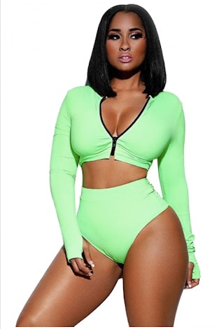 Pink Queen offers this sporty neon green two-piece in sizes S-XL. Long sleeved with a zipper opening in the front, this swimsuit could also be part of Kylie’s crew.
