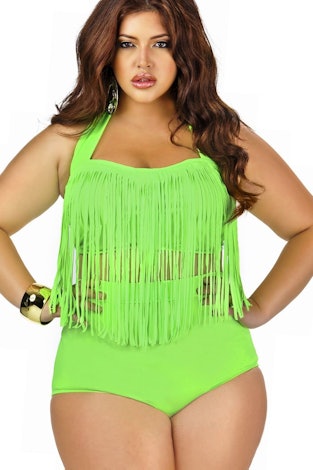 Thick babes can nab a saucier neon green (offers sizes 1X-3X) swimsuit like this one donning lots of fringe. Its ’60s style halter top will make you feel like you’ve traveled to the tropics in seconds.