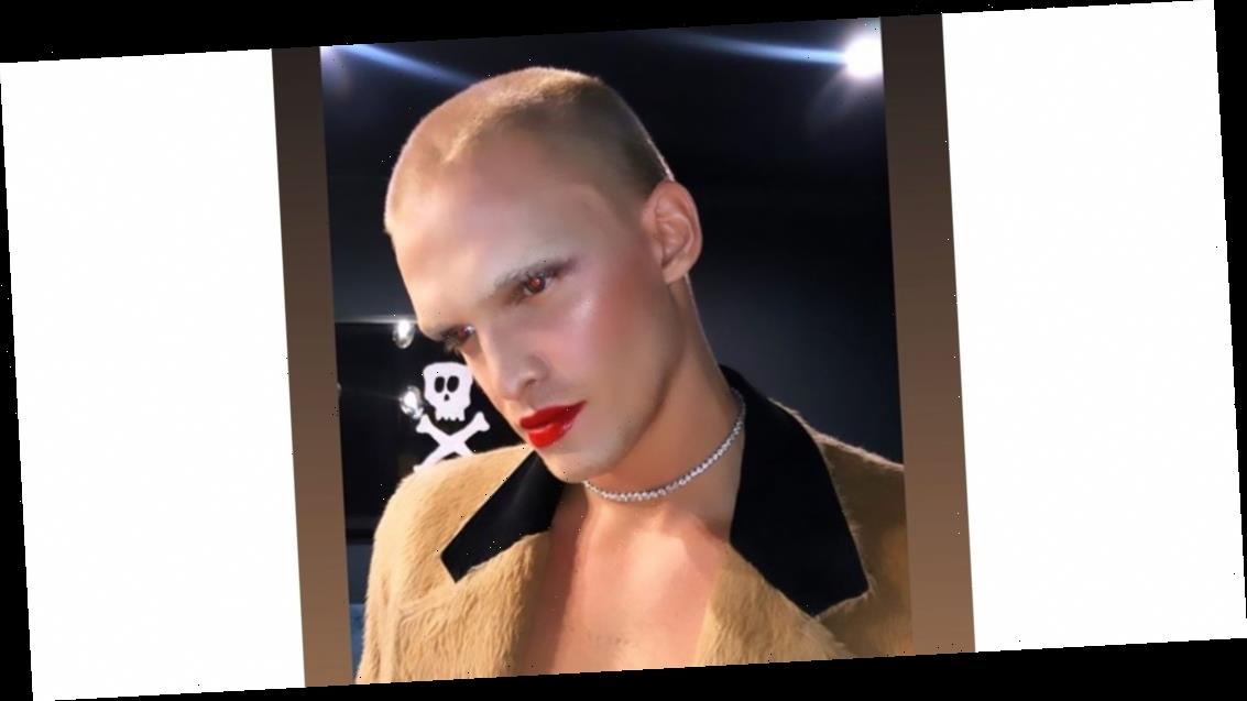To accompany his photo-ready makeup look, the songwriter wore a diamond choker necklace and a camel-colored jacket, styled wide open to reveal his bare chest.