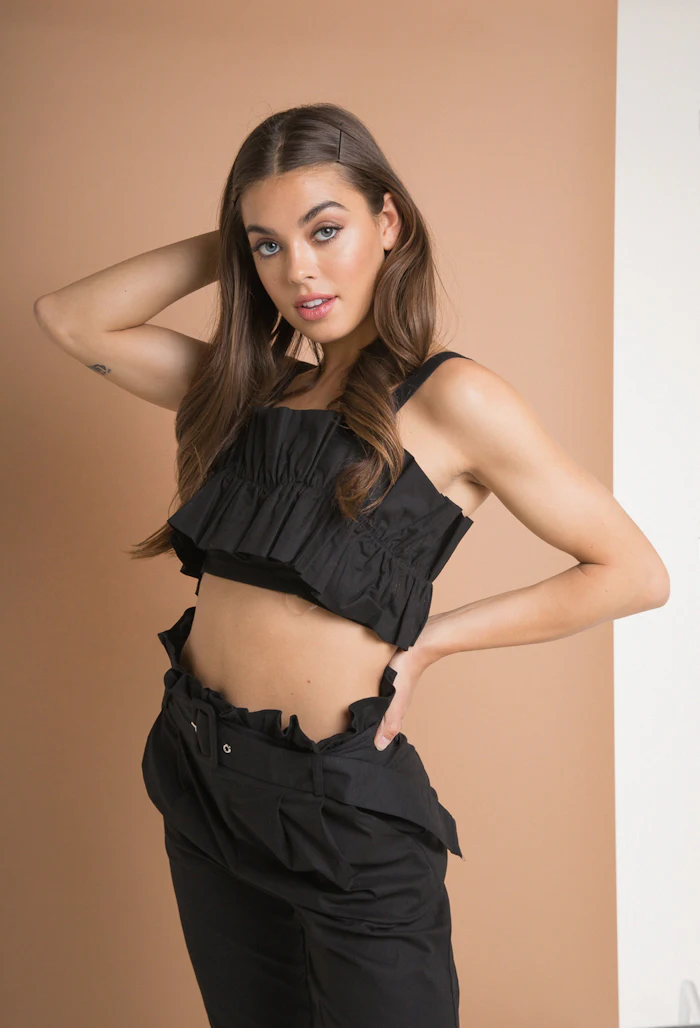 With her bleached blonde hair parted in the middle and knotted into a low bun, she wore a thick-strapped, ruffled crop top from brand Alpha Omega.