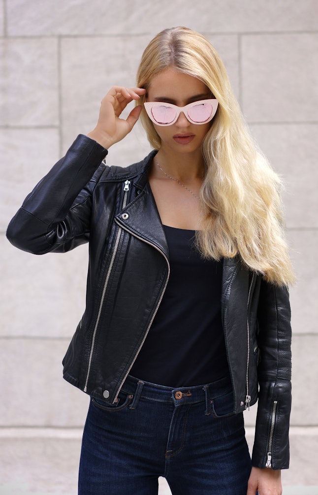 You can call them "rose gold." Or "millennial pink." The blush hue and mirrored lenses make for a stunning contrast with one another and with a fall-ready outfit such as this.