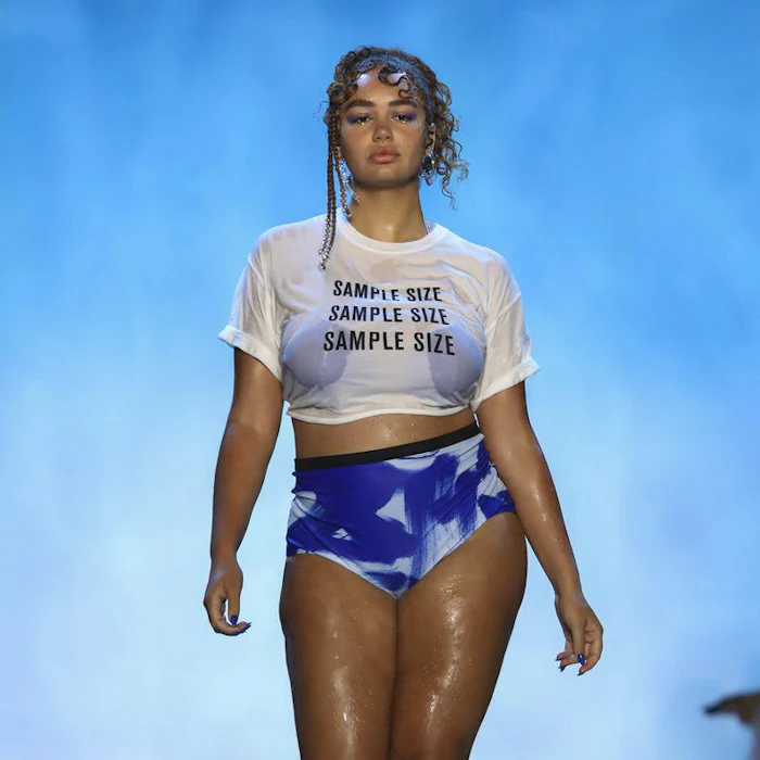 The shirt itself is a unisex heavyweight cotton t-shirt, and it has the word "Sample Size" screen printed on the front and a Chromat logo on the back. Even though it debuted on the runway, you can already buy the t-shirt on Chromat’s website for $60. The sizes run from XS to 3XL, and if you want the tee you will see that the landing page cheekily writes, "Every size is Sample Size. Click ‘add to cart’ if you agree."