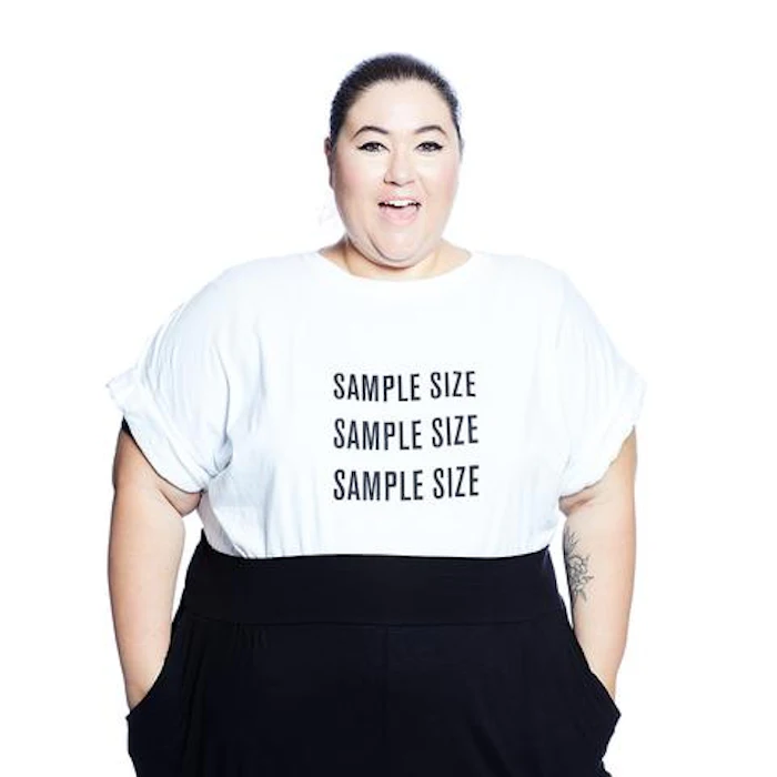 Now that the label is designing empowering clothes for all body types, they wanted to make a statement on their runway show. Models walked down in t-shirts that read "sample size" in big block letters, underlining that every size is a sample size.