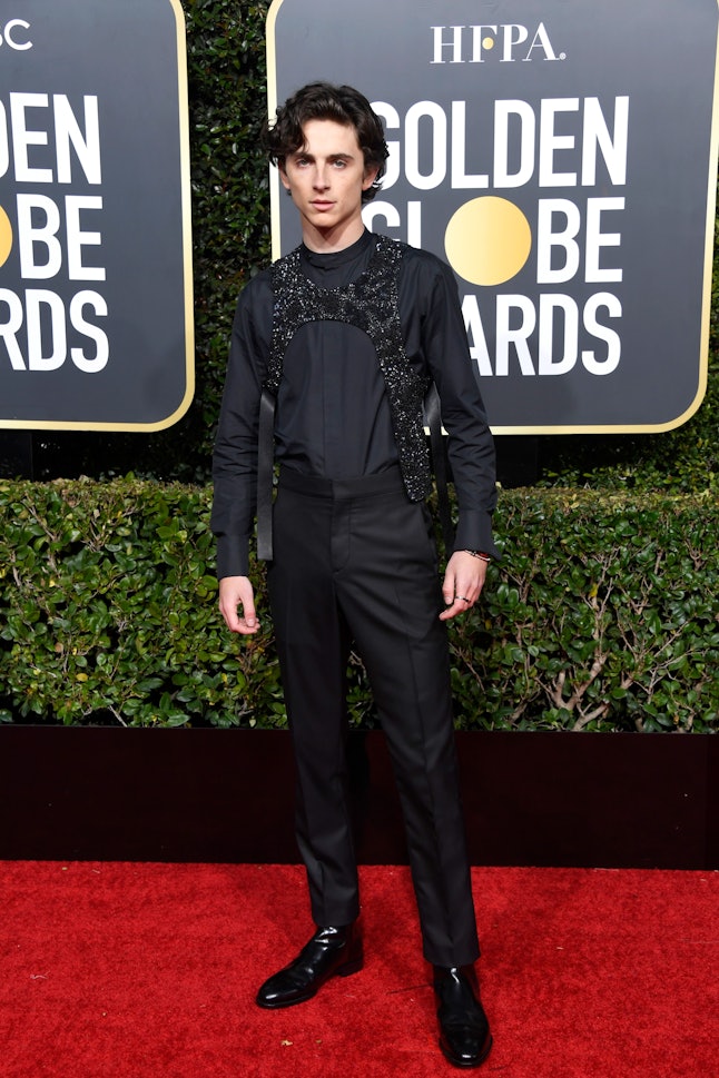 If you thought you were prepared for every Golden Globes fashion moment, you were wrong. So very, very wrong. Timothée Chalamet just wore a black harness to the Golden Globes, and rolled up to the red carpet like it was no big deal. And Chalamet didn’t just wear any harness either. He wore a sequined harness.