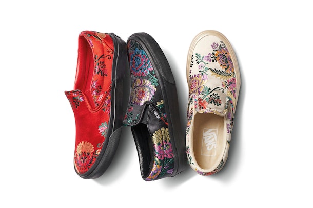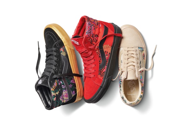 The Vans Sk8-Hi Reissue will come in black, red, and cream hues, all of which will also feature beautiful satin floral detailing. The detailing itself takes shape in beautiful jewel jones and its slick, luxe gloss renders the shoes perfect for fall and winter. The black style features a contrasting gold outsole and black leather side swoosh, the red style features a black outsole and leather swoosh, and the cream style features a cream outsole and leather swoosh.