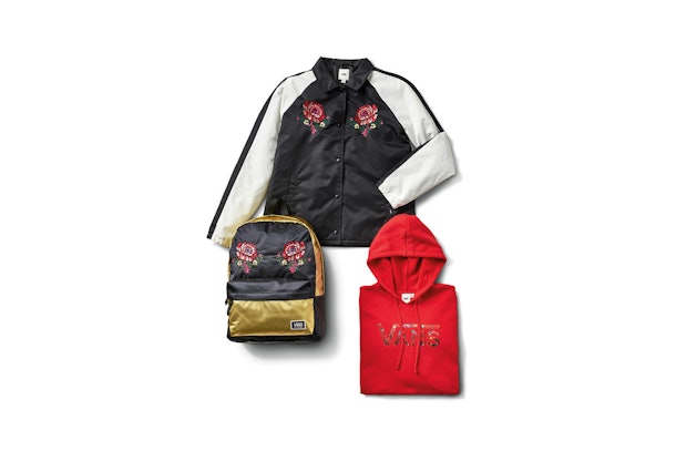 In terms of the collection’s other offerings, a hoodie, jacket, and backpack are also part of the lineup. The hoodie comes in a cherry red hue and features the VANS logo in the same print as the detailing on the shoes. The jacket is decidedly more intricate stylized; it looks to be a water-resistant material and features a button-up front, collar, and slit pockets. The bodice of it is black while shite stripes accentuate each arm and red and green floral designs adorn the front. It’d look great paired with a printed dress or black jeans and is one of those pieces that can be dressed up or down easily.