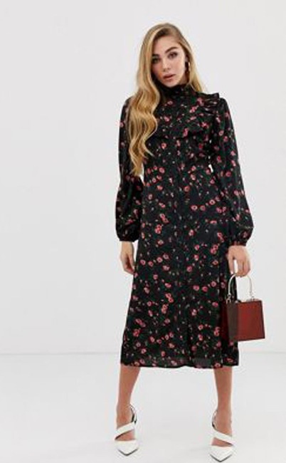 Fashion Union Button through Midi Shirt Dress with Ruffle Bib in Floral