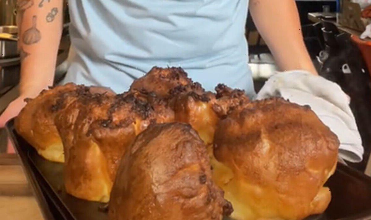 “Look at them, they’re monsters. They’re just ginormous,” the thrilled chef said when he took the large Yorkshire puddings out of the oven.