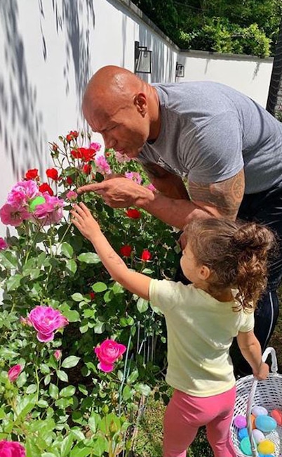 Dwayne took on the role of Easter Bunny as his daughter Jasmine hunted for eggs last spring.
