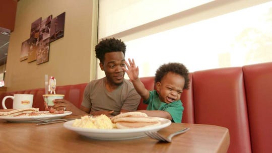 Dad DJ Pryor and son Kingston are back in another hilarious video! This time, they're in a Denny's commercial. (Photo: Denny's)