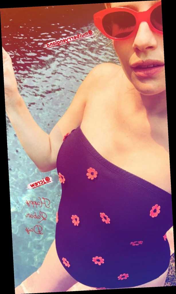 On Monday, the 29-year-old actress posed poolside and snapped a sunny picture of herself wearing a strapless one-piece bathing suit, with her growing bump on full display.