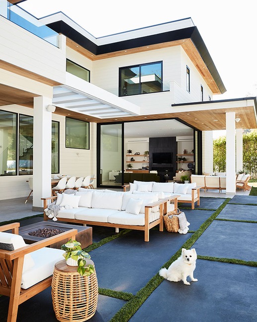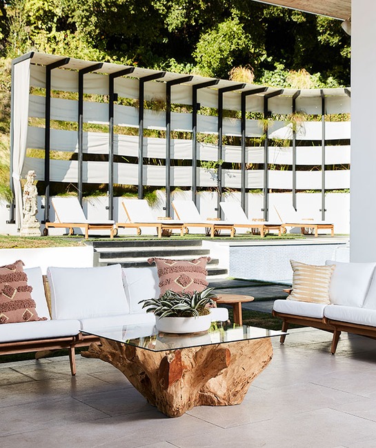 Considering Dewan told AllModern her favorite way to spend time at home is by “cuddling with family and sharing in good conversations,” there’s plenty of space to do that in this house, whether it be on the beloved green velvet couch in the living room or on one of the many white outdoor couches by the pool.